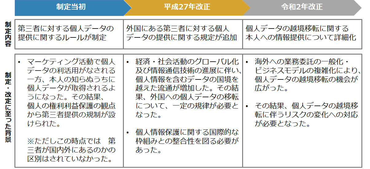 ただ、実際にご相談を受けるポイントは、平成27年改正において制定された「外国にある第三者に対する個人データの提供に関する規定」に関連するものが多いです。