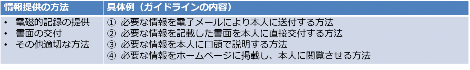 この点、「本人への情報提供の方法として、必要な情報が掲載されたウェブサイトの URL を本人に提供すること」も、適切な方法に該当する、とされています。